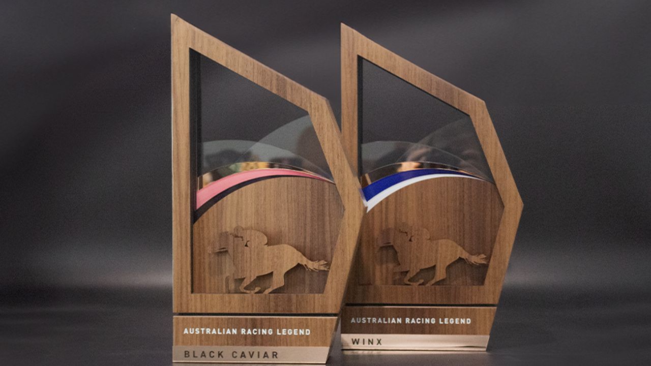These pieces were designed to honour some of the greatest names in Australian racing, including the larger feature awards presented to Winx and Black Caviar. For those trophies, we incorporated their iconic bib colours into the curved acrylic detail — a subtle but meaningful nod to their racing history.